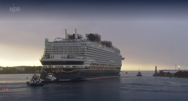 The ship got underway at around 1830 on September 1, with NDR reporting the harbor had been closed to all other ships and boats. A flotilla of tugs and harbor boats was on hand to assist the massive 1,122-foot (342-meter) vessel as it pushed off the fitting-out dock where it had been since April. It moved forward slowly and then pivoted with the assistance of tugs and its bow thrusters. The construction scaffolds still remain around the vessel's funnels.