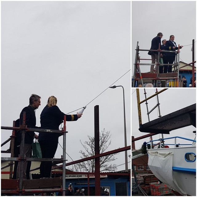 The christening was performed by the first female first officer in the Cassen Eils fleet, Samatha-Jill Hay. She did a great job, and the bottle burst open perfectly with lively force.