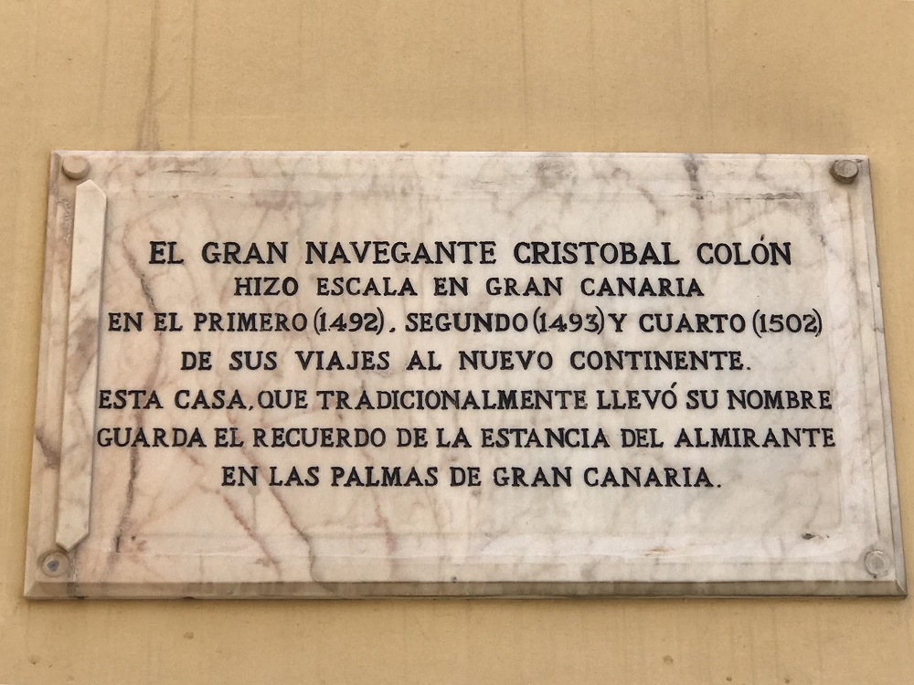 Sign at the Casa de Colon, Las Palmas: "The great navigator Christopher Columbus visited Gran Canaria on his first (1492), second (1493) and fourth (1502) trips to the New World. This house, which traditionally bears his name, keeps the record of the admiral's stay in Las Palmas de Gran Canaria." (Image courtesy Basil Karatzas)