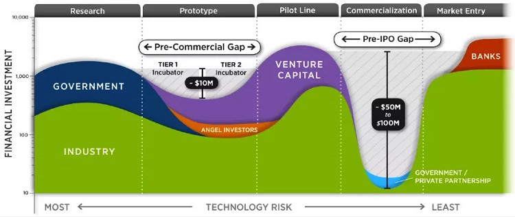 The Valley of Death and the Pre-Commercial Gap for developing a new technology. Source: Sandia National Laboratories