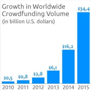 Crowdfunding using online platforms didn’t really take-off until about 2008, and even then there were only a handful of platforms. However by 2014 there were estimated to be over 1,000. Not only have the number of platforms increased, but so has the amount of money being channeled through them. In 2012 there was an estimated $2.7 billion in crowdfunding transactions, and in 2016 there was an estimated $34 billion.