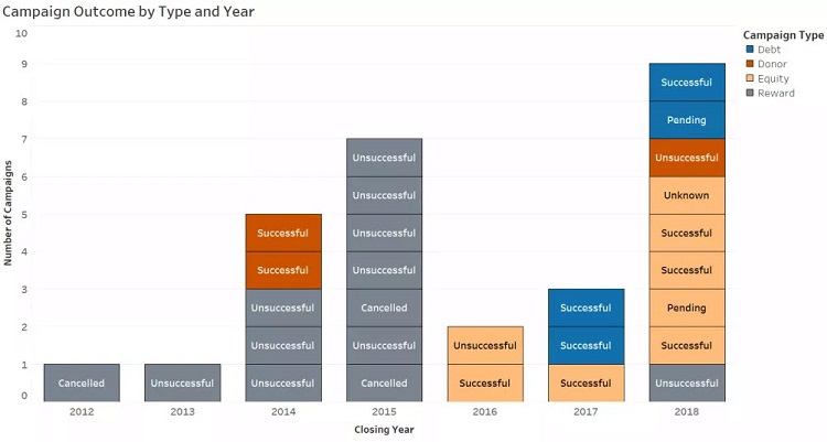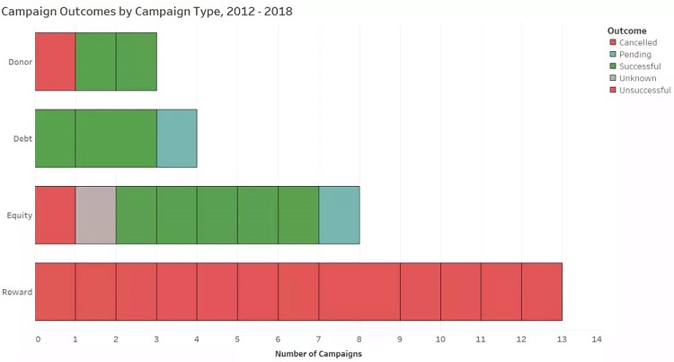 The data tells a convincing story: debt and equity crowdfund campaigns are more likely to be successful than reward type campaigns. There are several possible reasons why. One possibility is that equity crowdfunding is more self-selecting than reward based campaigns; the type of individual attracted to use an equity platform is more informed and more confident in their ability to choose investments and may have more capital to invest.