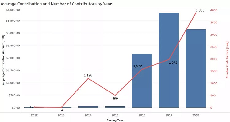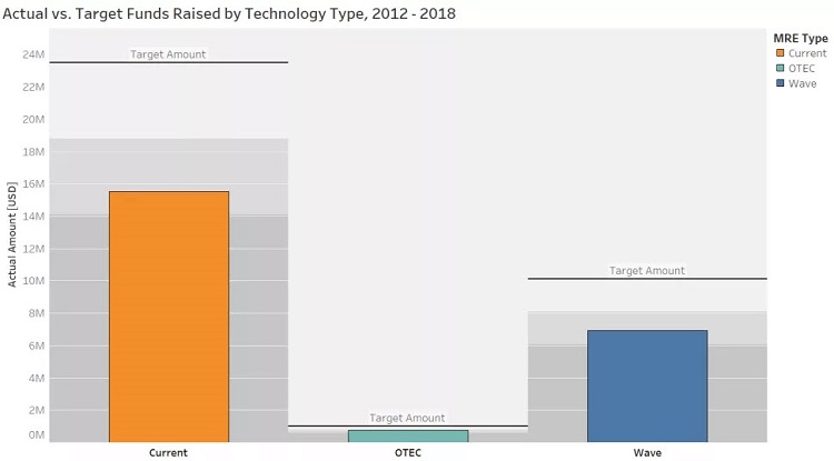 Looking at the the entire dataset from 2012 thru 2018, total contributions are more than $23.1 million. Breaking this number down by technology type, we see that wave energy campaigns attracted $6.9 million, but current energy technologies (river, tidal, ocean current) attracted more than twice that at $15.5 million. This hints at the relative maturity and commercial readiness of the two technology types: perhaps contributors see current energy (i.e. tidal energy) as less risky than wave.