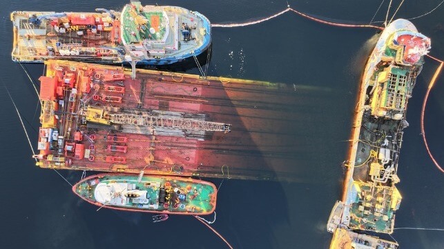 A notable example of how this is working is a wreck-removal in which the Resolve team converted a standard 300x100-foot barge into a semi-submersible. Using a salvor's heart and a spirit of ingenuity, with nothing more than standard maritime and hardware store equipment, the salvage team ballasted the converted semi-submersible barge beneath the wreck, then refloated both the barge and wreck vessel. It was a huge win operationally, but more importantly it illustrated how Resolve's in-house resources of marine towing, spill response and even a damage-control training school enable salvors to confidently think outside conventional maritime norms.